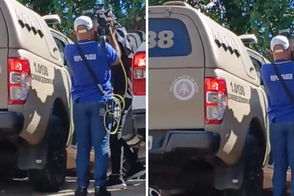 No vídeo, é possível ver quando o suspeito sai de um carro e é encaminhado para a viatura. No caminho, ele encontra o cinegrafista e dá o empurrão. A identidade do policial não foi confirmada.