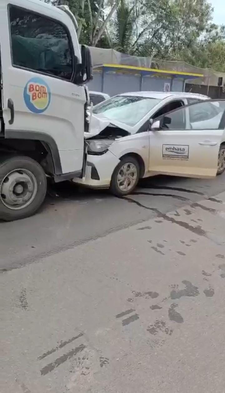 Um veiculo tipo caminhão baú da empresa Bom Bom sorvetes bateu de frente com um carro tipo passeio da empresa Baiana de águas Embasa.