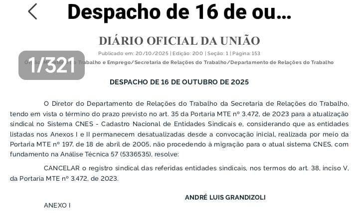Assim sendo, considerando que as entidades permanecem desatualizadas desde a convocação inicial, realizada por meio da Portaria MTE nº 197, de 18 de abril de 2005, e não procederam à migração para o atual sistema CNES, com fundamento na Análise Técnica 57 (5336535), foi feito o cancelamento do registro sindical das referidas entidades.