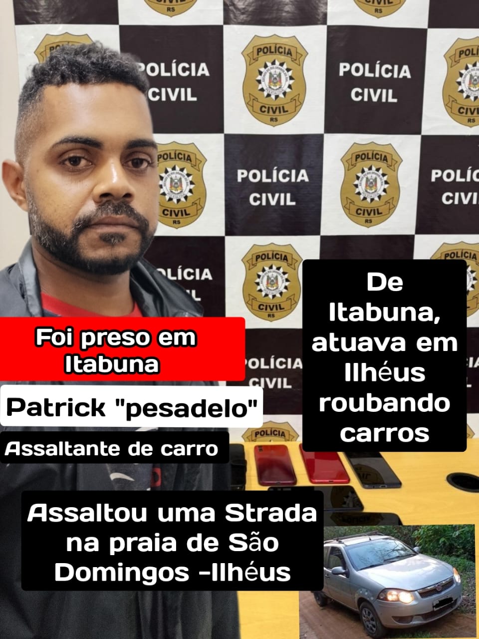 Um elemento conhecido por Patrick Pesadelo – foi preso nesta terça feira pela Policia Militar da Bahia agentes do 15º Batalhão BPM em Itabuna. Tudo aconteceu quando o ladrão tentava vender Strada Prata que ele tomou de assalto na Praia de São Domingos em Ilhéus, cujo registro está na Coorpin de Ilhéus.