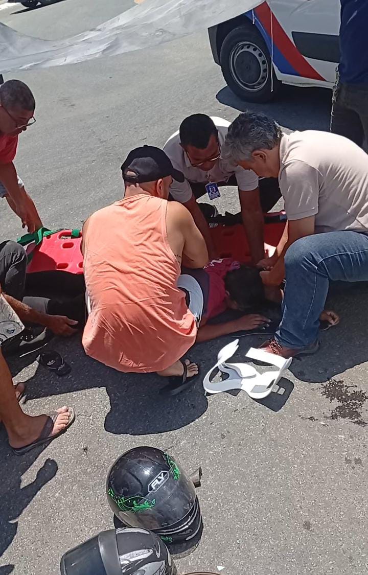 A mulher, ficou por quase uma hora caída no solo quente do asfalto, sob-aproteção de pessoas que passavam pelo local e resolveram ajudá-la, juntamente com o esposo e a pessoa do carro que se envolveu no sinistro.